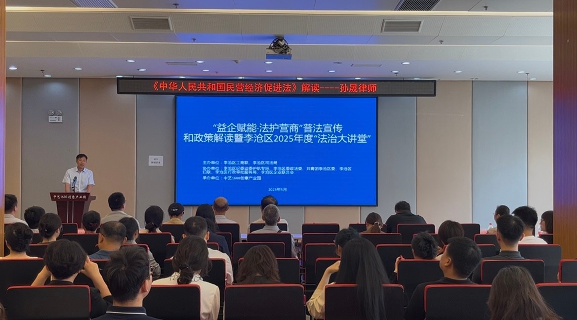 QMG青岛广电5月30日讯 为深入贯彻落实党的二十大精神,持续优化法治化营商环境,助力辖区民营企业高质量发展,5月29日上午,李沧区司法局与区工商联等部门联合举办“益企赋能·法护营商”涉企法律政策宣讲活动。活动邀请山东颐衡律师事务所律师围绕新出台的《民营经济促进法》及修订后的《公司法》展开深度解读,60余位民营企业家参加。